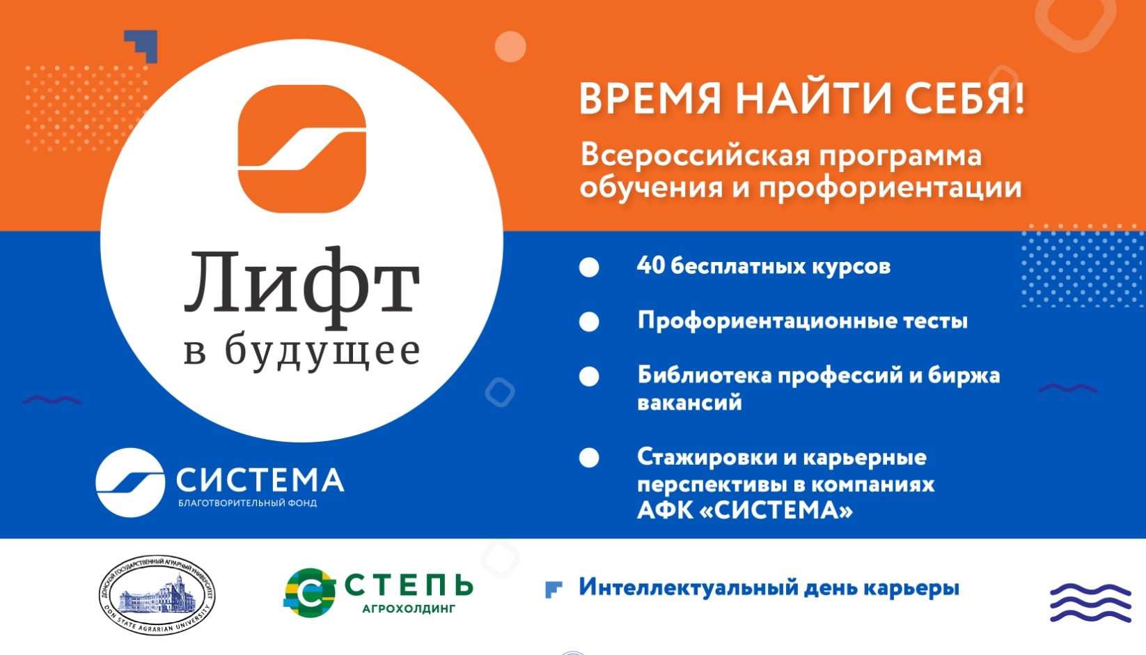 Цифровая платформа «Лифт в будущее» – единственный в своем роде проект на стыке цифровизации образования и глубокой аналитики отраслевых потребностей в кадровом обеспечении отечественной экономики, это открытый доступ к обучающим программам и профориентационным тестам, к библиотеке профессий и бирже вакансий компаний «АФК «Система», а также к интернатуре и стажировкам, консультациям наставников из числа ведущих сотрудников Корпорации, ее активов и приглашенных специалистов.